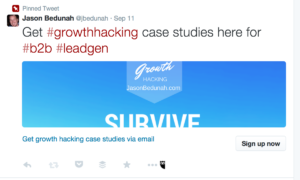18. Pin your lead gen twitter card to the top of your timeline so anyone reviewing your profile sees it and can sign up. Here’s mine: